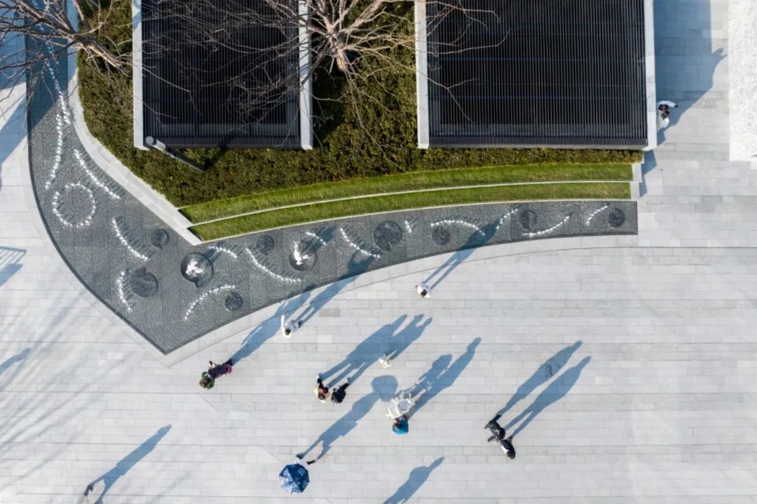 景觀內容的選擇上,三面云山的樹陣表達圓形廣場的西湖水,以及在邊界處長紋綠整石構建的連續臺地荷葉連連水景以及散落櫸樹下的藝術坐石,整體上去實現小場景-大氣象小細節-大文化小空間-大杭州