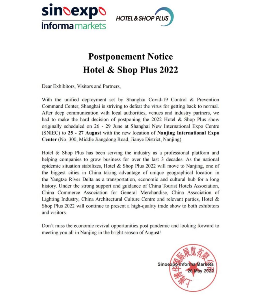 Hotel & Shop Plus 2022 Postponed to 25 - 27 August in Nanjing