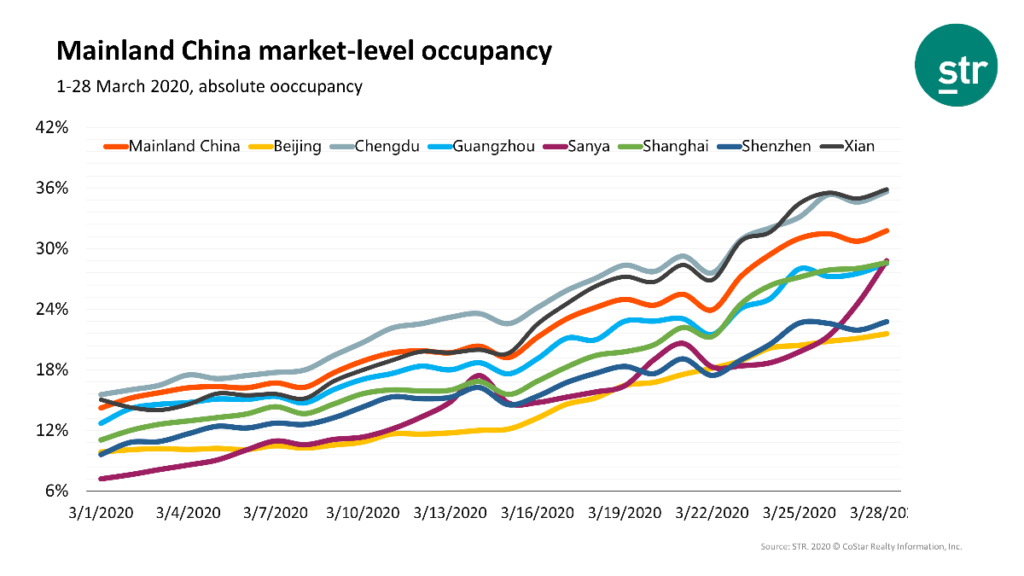 Mainland China’s daily hotel occupancy reached an absolute level of 31.8% on 28 March, up from a low of 7.4% during the first week of February, according to preliminary data from STR. Additionally, opening rates have been significant in key markets across the region.