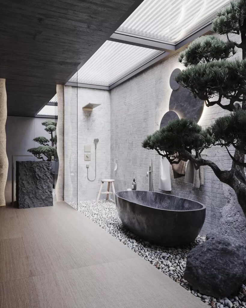 For some large bathrooms, integrating idyllic landscape and gardening element into the design make the bathroom has more possibilities, like being out in nature with beautiful scenery. At the moment, the bathroom becomes a space of art.