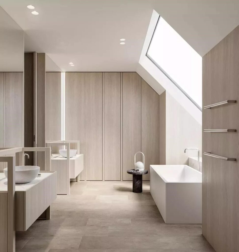 Wood element can be used to create a cozy atmosphere, instead of acrylic or ceramic which might make people feel cold, transforming the bathroom from a place only for short stay to spiritual rest. When integrating wood element into bathroom design, it is necessary to select and use waterproof timber or apply water repellent treatment on wood materials.