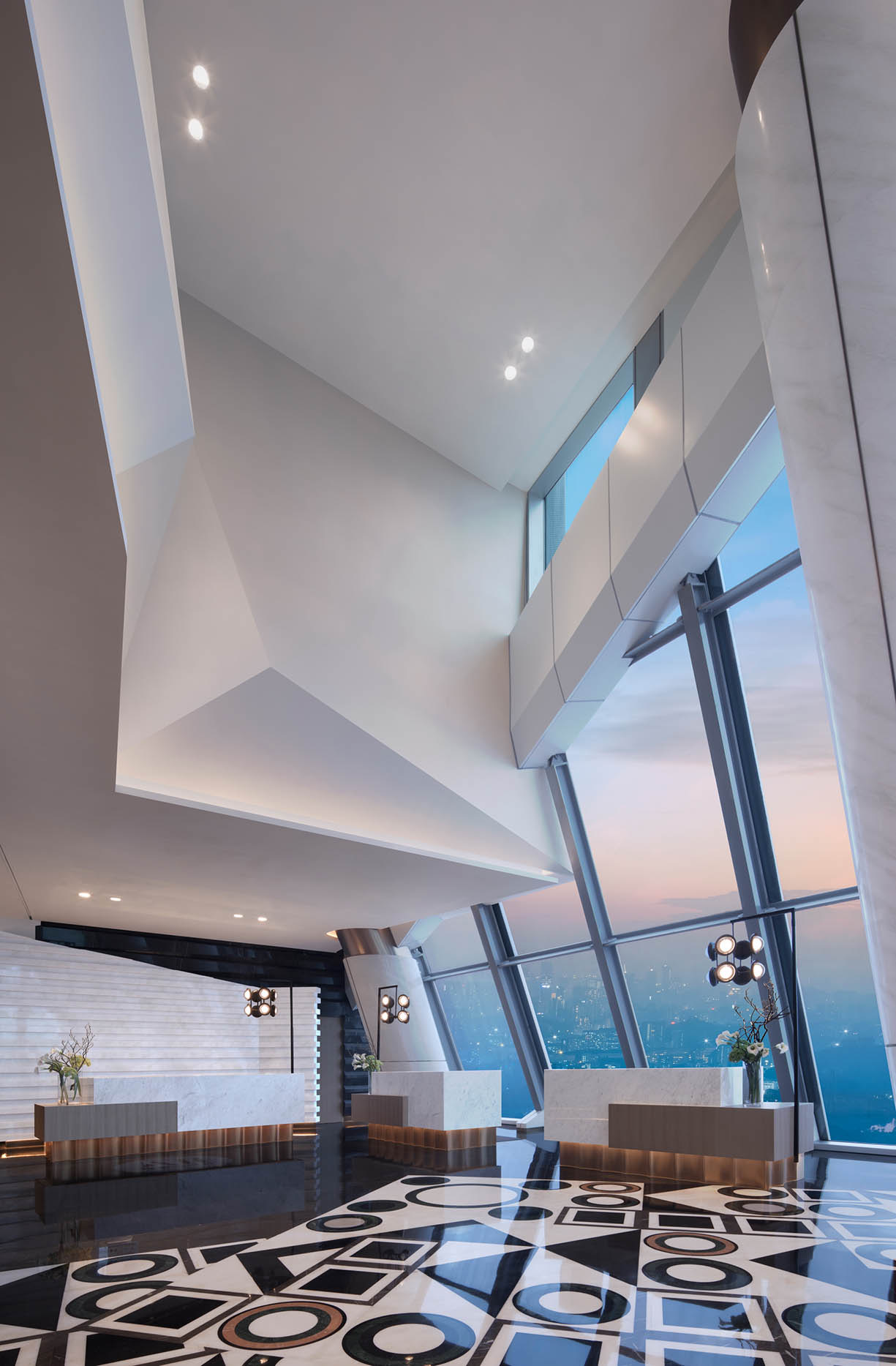乘坐高速電梯,登上位于46層的酒店空中大堂,可以獨享258米高空之上360度的全景視角。步入了這座云端酒店,大堂的頂部均布置了雅白的立體折面天花,全景觀空中大堂在設計上大量運用線性元素,營造出獨具幾何美學的視覺空間。