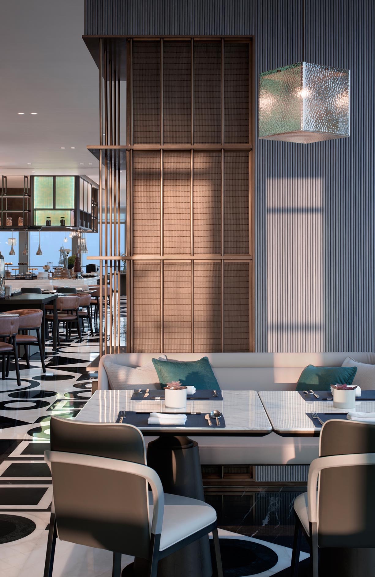 全日餐廳延續法式風情,墨綠、深灰、暖橙圖案交錯,與大堂共譜整體韻律感。細密線性格柵,創意序列燈具,營造強烈秩序感。大堂酒廊是賓客休憩和社交的好去處,啟幕云端流動盛宴。