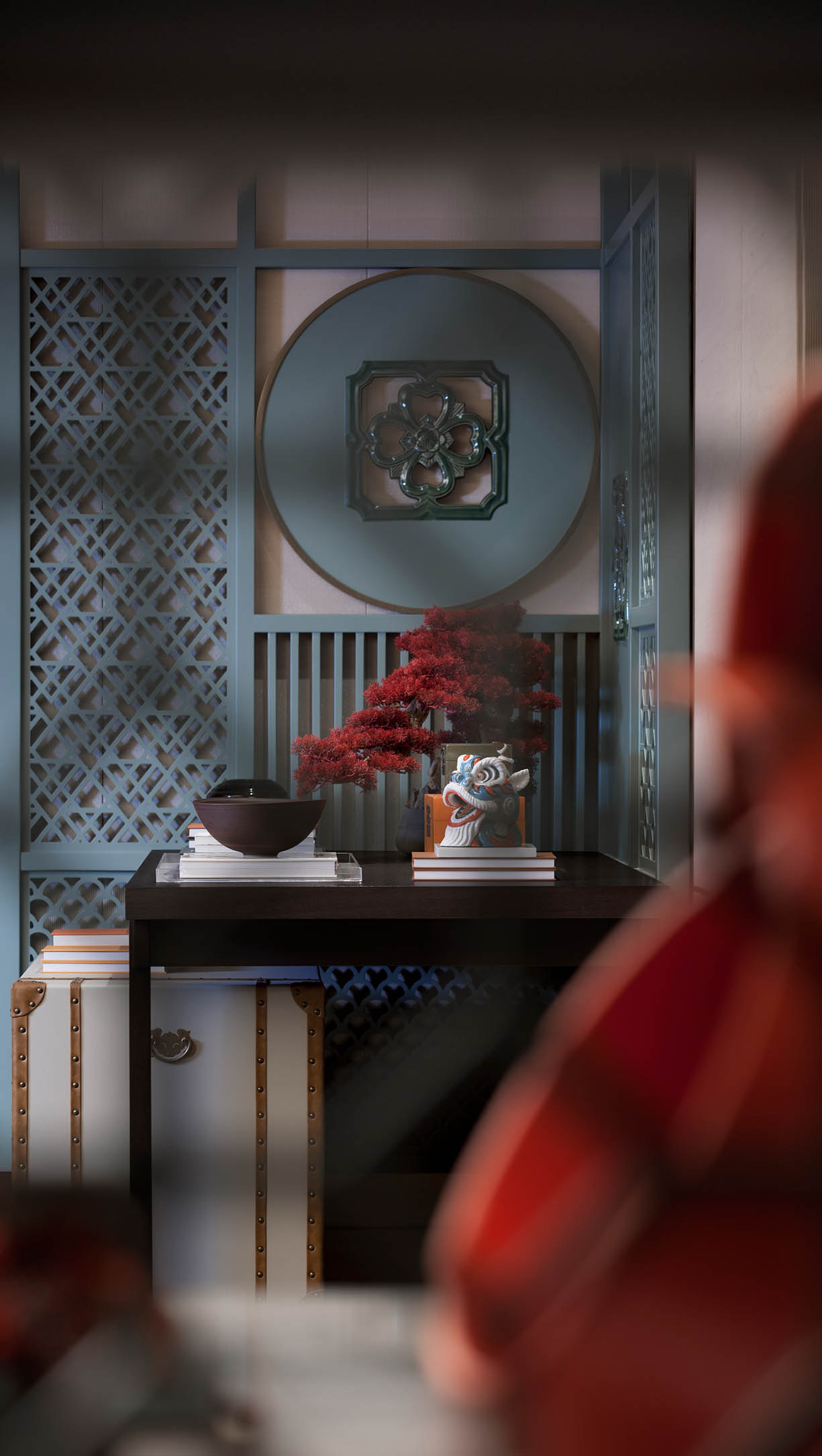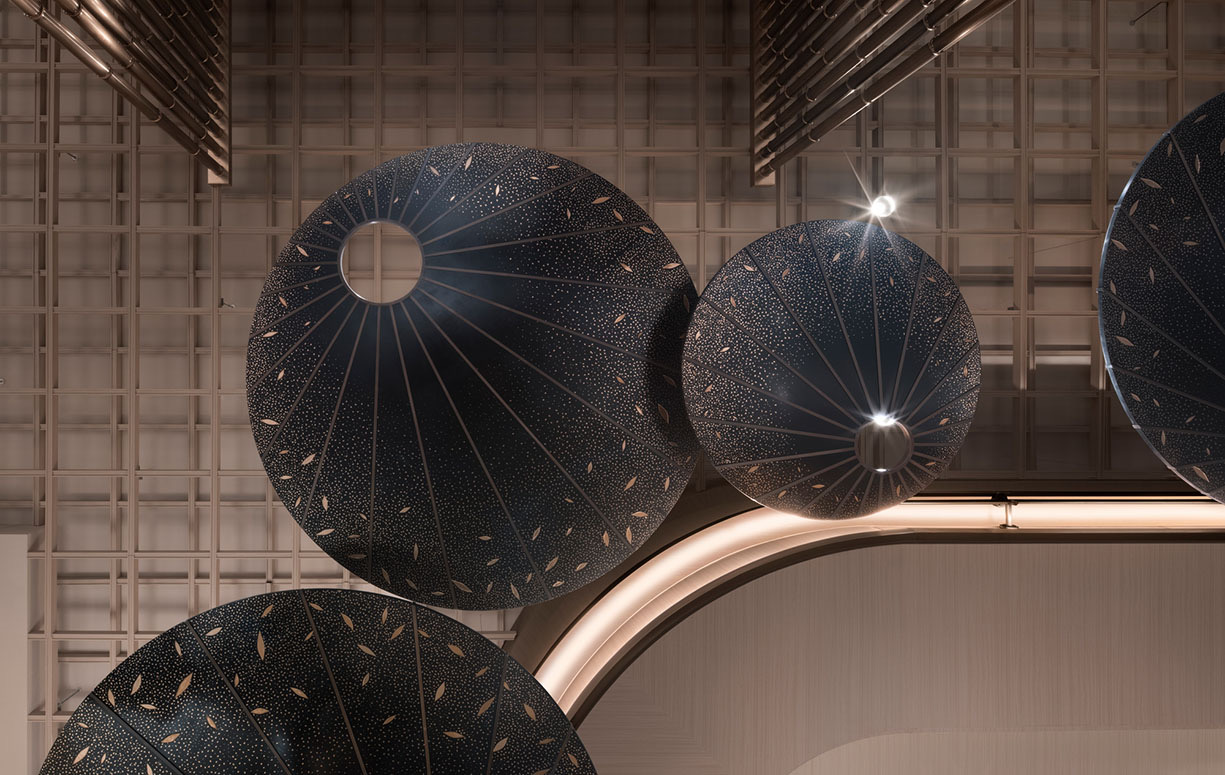 圓形和風傘飾、面面矩形窗花,構建清冷克制的日式美學。